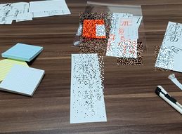 事務所に持ち帰って、私が詳しい使い方と、どんな霊符かを、付箋に貼っていきます。